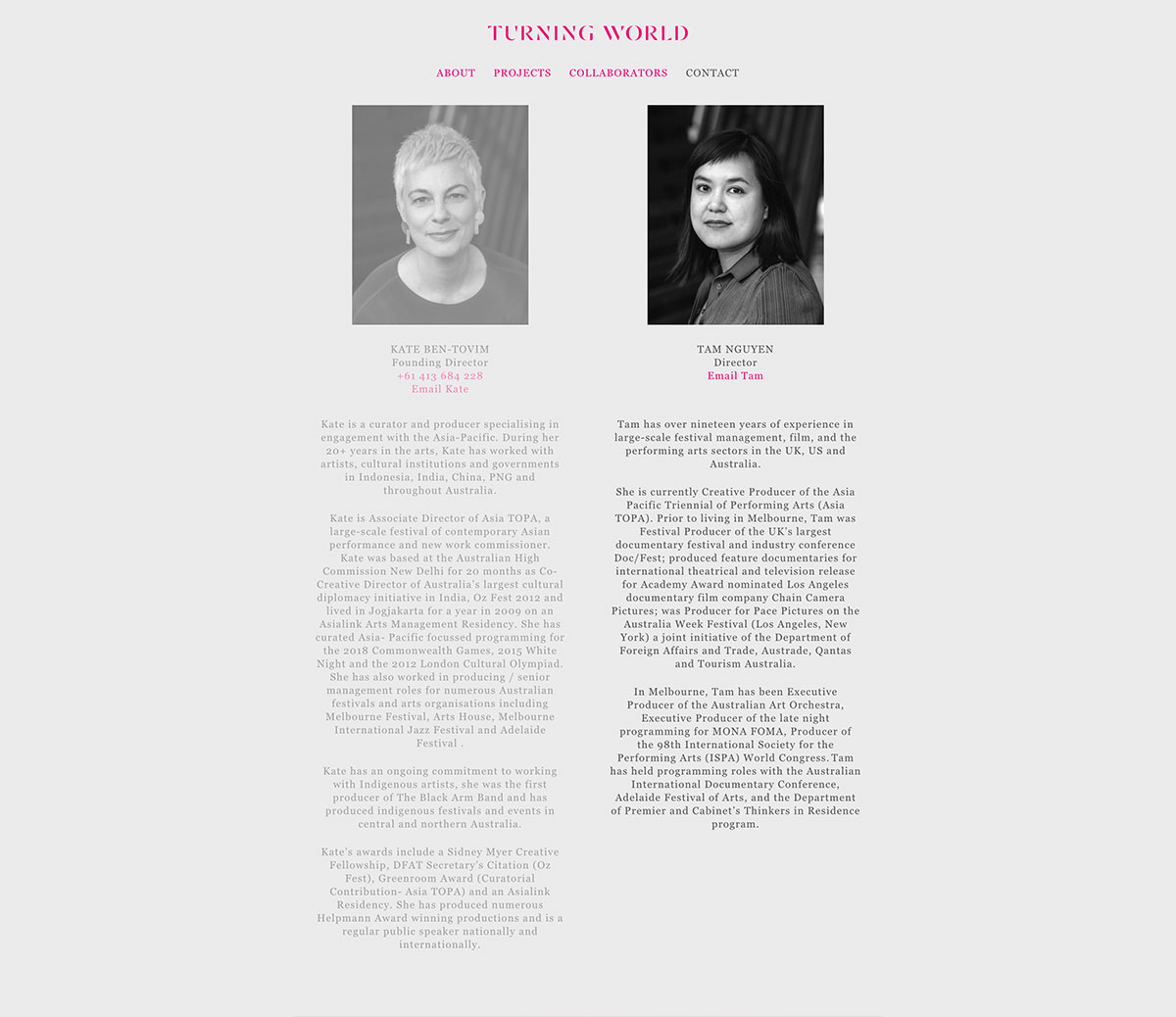 Turning World is a boutique cultural agency connecting contemporary cultures in Australia and the Asia Pacific.